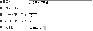 フィールド表示桁数および行数でボックスのサイズを設定します。入力制限は上のテキストフィールド(1行入力)と同様です。