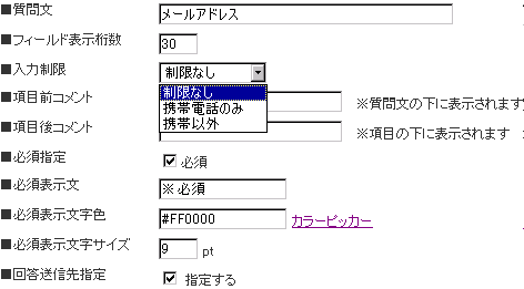 「フィールド表示桁数」でボックスの横サイズを決定します。「入力制限」で、アドレス形態に応じて入力制限を設定可能です。また、フォームの送信結果を管理者のみでなく回答者にもメールで送信したい場合は、「回答送信先指定」に必ずチェックを入れます。